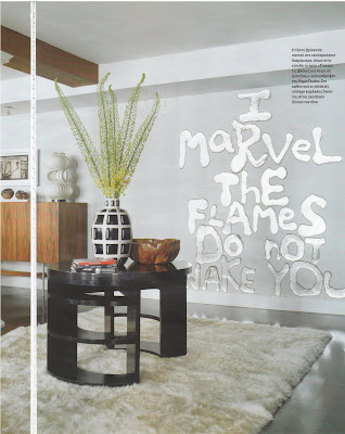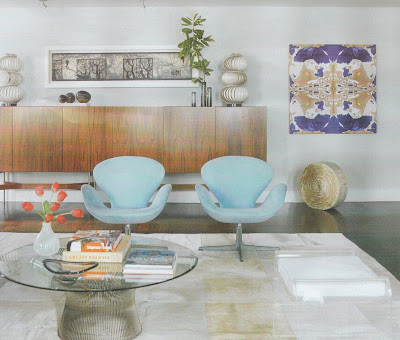 Οι γαλάζιες καρέκλες “Swan” είναι του Arne Jacobsen και θα ‘θελα να είχα δύο και εγώ. Το ανάκλιντρο είναι της Aero και το τραπέζι από την Knoll του Warren Platner. Μου αρέσει ο πύθωνας σφυρηλατημένος πάνω σε ξύλο στη μπορντούρα του τζακιού με εστία από όνυχα, δε ψοφάω για τη προθήκη των ξύλων δίπλα. Το μπαρ είναι ο “άσος” του σπιτιού αφού για να εμφανιστεί το ράφι με τα ποτά πρέπει να πατήσεις ένα μυστικό κουμπί.