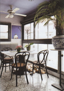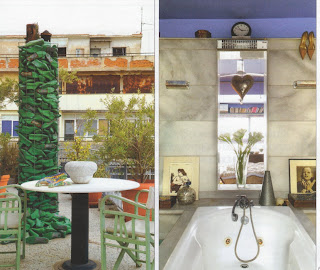 Στο μπαλκόνι μία στήλη με καλαπόδια στο πράσινο, κάνει το έργο τέχνης και στο μπάνιο υπάρχει μάρμαρο παντού και ο Φασιανός στα αριστερά.