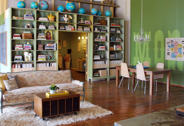 Και εδώ αφού μπήκαν και ο τοίχος που είχε κάτι πτηνά που πετούσαν να αποδημήσουν στην κουζίνα, βάφτηκε πράσινος με στένσιλ γράμματα. Πάνω στη βιβλιοθήκη μια συλλογή από υδρόγειους σφαίρες και όλα τα εύκαμπτα περιοδικά τοποθετημένα στα ξύλινα κουτιά του Ikea. Ο πολυέλαιος κρεμάστηκε χαμηλά όπως πρέπει περίπου 60εκ. από το τραπέζι. Πανδαισία.