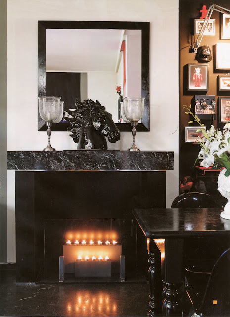 Το τζάκι είναι ψεύτικο, αλλά φωτίζεται με κεριά και φέρει το απίθανο κεφάλι αλόγου, μαύρο, δίπλα στη μαύρη τραπεζαρία της μαμάς του ιδιοκτήτη με τις καρέκλες, καρέκλες του verner pantone. Η κόκκινη βιβλιοθήκη ikea μου κάνει κάτι σε ανατολίτικη επιρροή και μαζί με τη disco ball και τα απίστευτα αντικείμενα αυτομάτως σου κάνει eclectic chic.