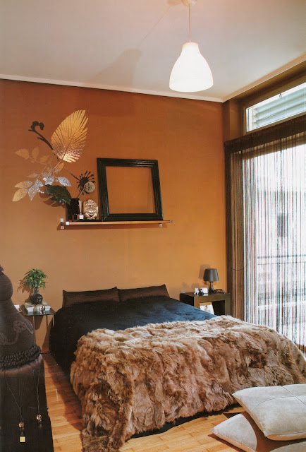 Το κρεβάτι ήταν ειδική παραγγελία και από πάνω ένα ράφι με άδεια κορνίζα και αυτοκόλλητα λουλούδια δίνουν ατμόσφαιρα. Μου αρέσει η γούνα ριχτάρι στο ποδαρικό που χαρίζει πολυτέλεια.