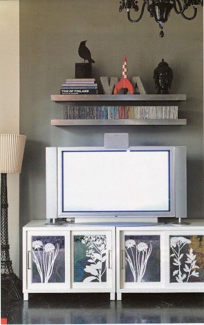 Το έπιπλο της τηλεόρασης σχεδιάστηκε από το διακοσμητή Ηλία Γαβριήλ, ειδικά για αυτό το σπίτι. Λευκό με τα λουλούδια μάλλον από βινύλιο, μοστράρει απίθανα μπροστά στο γκρι τοίχο δίπλα στο απίστευτο φωτιστικό πύργο του Εiffel με το καπέλο ανάποδα.
