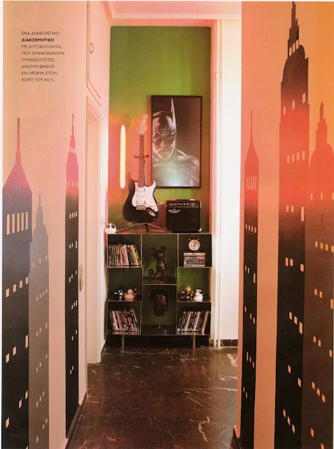 Ρε παιδιά τι ωραίο σπίτι είναι αυτό. Ένα διαμέρισμα στην Αθήνα, φουλ προσωπικότητα. Μου αρέσει που έχει πολλά αντικείμενα και funky διάθεση και φαντασία. Τα αυτοκόλλητα τοίχου (wall stickers ή murals) έχουν απλωθεί σε πολλά σημεία μέσα στο σπίτι, για να δώσουν αέρα Νέας Υόρκης. Παρεμβάσεις δομικές δε χρειάστηκαν πολλές σε αυτό το διαμέρισμα του ’70. Η διαρρύθμιση του δεν ήταν πολύ μακριά από τα σύγχρονα πρότυπα. Βέβαια κάποιες φορές όλα αυτά δεν μετράνε μπροστά στον αέρα που αποδίδει το σπίτι.