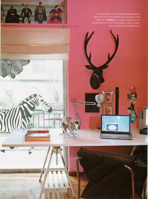 Το δωμάτιο του γραφείου -και αυτό τίγκα στη μινιατούρα- σε έντονο ροζ, το έπιπλο του με πόδια καβαλέτο και μια τάβλα παραγγελία για να ταιριάζει στις διαστάσεις του χώρου. Διακοσμητικά φουλ και το κεφάλι του ταράνδου που “τα σπάει” και μου θυμίζει αυτό. Η καρέκλα είναι από το κατάστημα DOM στο Παρίσι και η ζέμπρα αυτοκόλλητη στη τζαμαρία με πάει σε άλλο κόσμο. Σουρεάλ, μια ζέμπρα στην Αθήνα.