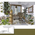 Η σύνδεση εσωτερικού και εξωτερικού χώρου και η αισθητική αλληλουχία τους, βασικό αίτημα της ιδιοκτήτριας, αποτέλεσε την αφετηρία της έμπνευσης για τους χώρους του καθιστικού-τραπεζαρίας και της βεράντας της κατοικίας. Κεντρική ιδέα η περιοχή της Τοσκάνης στην Ιταλία, γενέτειρα της Αναγέννησης και κάτοχος μιας πλούσιας πολιτιστικής κληρονομιάς. Η χρωματική παλέτα παραπέμπει στο πλούσιο οπτικά τοπίο της Τοσκάνης, γεμάτο ελαιώνες, κυπαρίσσια, αμπέλια, λουσμένο στο λαμπερό ηλιακό φως, Τερακόττα, βελούδινο πράσινο και πράσινο της ελιάς, κίτρινο του καλαμποκιού και πορτοκαλί μοιράζονται απλόχερα στο χώρο. Κεραμικά βάζα και μαξιλάρια τονίζουν την κεντρική σύλληψη, ενώ εμφανής είναι και η ύπαρξη του σκανδιναβικού στοιχείου, ως δευτερεύοντος ύφους, στις σκαλιέρες που πλαισιώνουν την τηλεόραση και στις καρέκλες της τραπεζαρίας. Το άσπρο χρώμα φρεσκάρει και υπογραμμίζει τα πλούσια χρώματα της παλέτας.