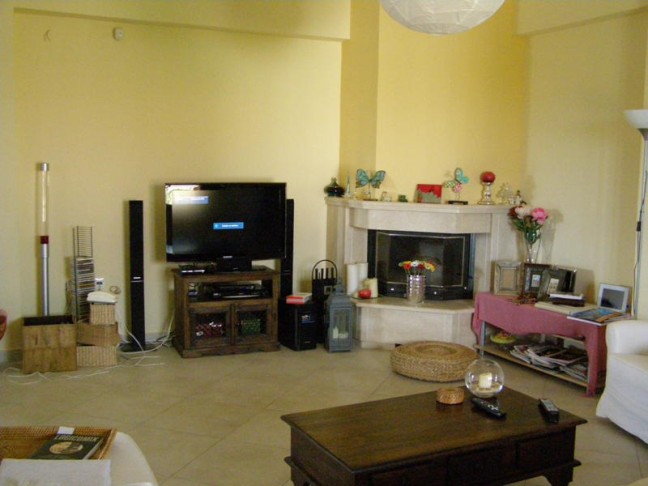 4. Δεξιά από το τζάκι (φώτο 3) έχουμε βάλει πρόχειρα ένα παλιά έπιπλο τηλεόρασης με περιοδικά (ξέρω, δείχνει λίγο χάλια). Εκεί έλεγα να μπει μπαουλάκι με μαξιλάρες, ή τραπεζάκι με με κάποιο βάζο ή κεριά. Και από πάνω να κρεμάσουμε αυτές τις κορνιζούλες. Να τις βάλω σε σειρά ή τυχαία;