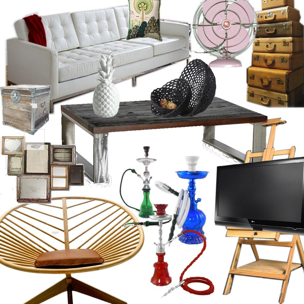 So, ένας καναπές σε σύγχρονο γλυκό ύφος ή γενικά πάρ\’ τον τετραγωνισμένο άλλα όχι υπερπαραγωγή! Τις βαλίτσες θα ήθελα να τις ρίξεις έτσι σε ντάνα ψηλή στα δεξιά του όπως βλέπουμε τώρα τον άλλο, για να κρύψεις το καλοριφέρ. Τα μπαούλα σου και τα κουτιά σου από την άλλη του πλευρά δίπλα σε μια μοντέρνα έθνικ καρέκλα πολυθρόνα. Το σετ με τα vintage κορνιζάκια είναι από το Anthropologie, λίγα πλεχτά και εξωτικά πράγματα πάνω στο τραπέζι από τον Morphos και φυσικά οι ναργιλέδες σου στη γωνία που τους θέλεις, πάνω σε ένα απλό κιλίμι, όχι άλλα τραπεζάκια please. Από εκεί και μετά θα μου άρεσε μια ανατροπή που θα έβαζε την μεγάλη τηλεόραση σε ένα καβαλέτο ζωγράφου. Νομίζω ότι θα συμπληρώσει πολύ αεράτα το ύφος. Το ίδιο styling να ακολουθήσεις και στην τραπεζαρία και θα είσαι εντάξει. Η πολυθρόνα φυσικά μπορεί να πάει να κάτσει προς το παρόν μπροστά στον άδειο χώρο της κουζίνας με ένα τραπεζάκι μαζί. Συμπληρωματικά μπορείς πάντα να ρίξεις πουφ Μαροκινού ύφους σε διάφορα έντονα χρώματα και ίσως κάποιον πίνακα μοντέρνο στον τοίχο σε κόκκινες πάλι αποχρώσεις. Good? Για μιλήστε και εσείς Rdeco-fanakia..