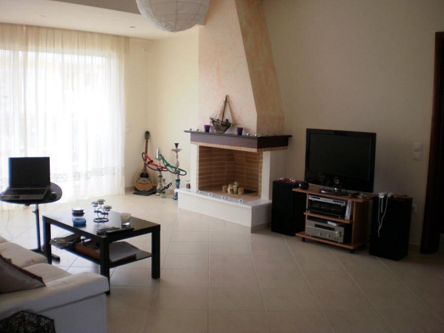 Το κυριως προβλημα μας ισως είναι ότι δεν ξερουμε τι να κανουμε οσον αφορα το επιπλο τηλεορασης-στερεοφωνικου. Επειδη το σαλονι είναι ενας εξαιρετικα φωτεινος χωρος (βανιλια -υποθετω- το χρωμα των τοιχων και μπεζ πλακακια-με καποιες αποχρωσεις του ανοιχτου καφε και γκρι!- και ηδη τα επιπλα που εχουμε διαλεξει είναι ανοιχτοχρωμα πιστευουμε ότι αν βαλουμε καποια συνθεση σε λευκο χρωμα το ολο συνολο θα είναι εξαιρετικα αχρωμο και αδιαφορο και θα εχει απιστευτα μεγαλη αντιθεση με το υπολοιπο σπιτι που λογο ξυλου είναι εκ των πραγματων πιο «σκοτεινο». Επισης αριστερα του τζακιου θελουμε να διατηρησουμε στην θεση αυτή τους ναργιλες μας (ναι εχουμε πολλους και αυξανονται) και η σκεψη ηταν καποιος σοφρας που πανω θα μπουν οι ναργιλεδες και μαζιλαρες για να δημιουργουν μια ιδιαιτερη γωνια με ανατολιτικο χρωμα.
