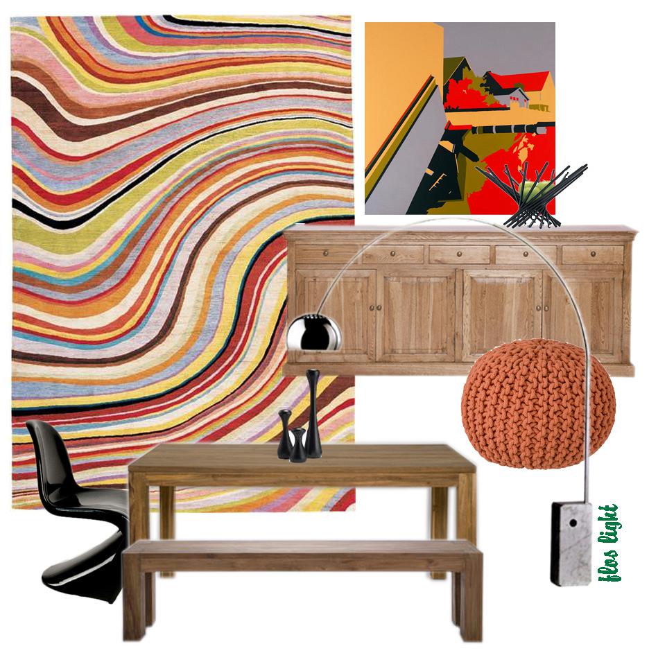 Στη θέση 3, που έχεις το μπουφέ, σου έφτιαξα ένα combo και έτσι θα καταλάβεις και το ύφος που θα μου άρεσε να πάρει το σπιτάκι σου. Λοιπόν, το είδα πως θέλει και χρώμα και σχήμα, λιτό σε γενικές γραμμές με ορισμένα κομμάτια design και γενικά αυτό που αποκαλώ εγώ αρχιτεκτονικό σπίτι. Ο μπουφές και το τραπέζι κρατούνται βεβαίως, οι καρέκλες (μου το επέτρεψες) θα φύγουν και θα βάλεις ωραίους πάγκους, με αξαίρεση τις κορυφές που θα έβλεπα δύο verner panton σε μαύρο. Το φωτιστικό σου στο σημείο εκείνο επειδή προοπτικά από την πόρτα θα βλέπεις δύο (λόγω καναπέδων) θα το προτιμούσα να είναι ένα επιδαπέδιο (θέση 7) like Flos, που να σου φωτίζει το τραπέζι σου μια χαρά. Άλλωστε έχεις και τις απλίκες γύρω-γύρω. Πάνω στο μπουφέ σου έναν πίνακα με σπίτια, αλλά σε χρώμα, πουφ πλεχτό σαν συμπλήρωμα και ένα χαλί πάλι σε χρώμα και λοξά σχήματα αφού έχεις λοξάδες και στους τοίχους. Για μένα απόλυτη ισσοροπία.