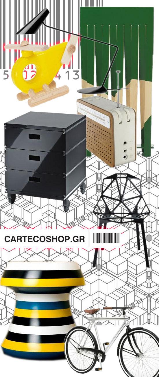 Συνεχίζουμε για σήμερα με την Carteco ως εταιρεία αλλά και το νέο της Carteco Shop, που βγήκε on-line. Διάλεξα τα πιο όμορφα με βάση το πρασινο, το κίτρινο και το ξύλο. Αξίζει να μπείτε και να δείτε τις ταπετσαρίες του, τα διαχωριστικά του, αλλά και τα παιδικά του παιχνίδια.