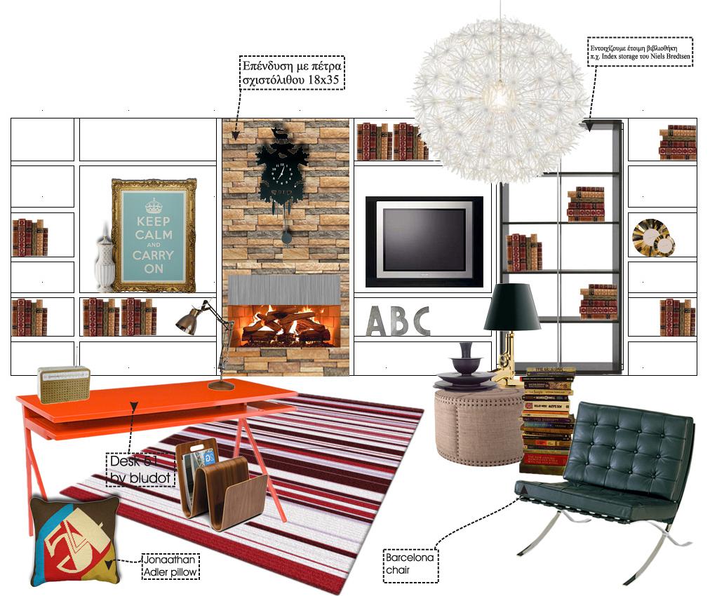 Γεια σου George. Σήμερα θα ασχοληθούμε με τα 8,03μ. του σαλονιού σου, που δεν ξέρεις πως να κατανείμεις σε τζάκι, ράφια, Τιβί κτλ. Εγώ στα μοίρασα και ορίστε: