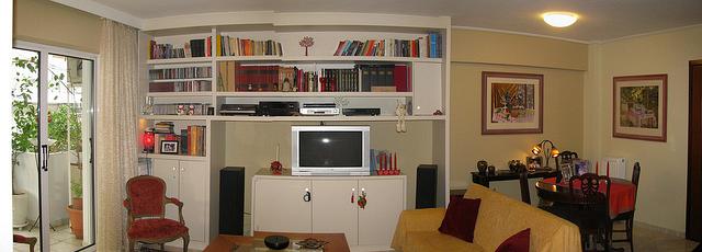 Όπως βλέπετε στις φωτο στο σαλόνι μου δεσπόζει μια βιβλιοθήκη την οποία σχεδίασα με σκοπό να καλύψει τις ατέλειες του τοίχου (κολόνα αριστερά πίσω από τα CD και δοκάρι πίσω από το ψηλότερο ράφι) και παράλληλα να είναι λειτουργικό. Επίσης εξαφανίζει και τον πίσω όγκο της ΤV (32’’ CRT) της οποίας το γκρίζο γυαλί πάντοτε με ενοχλεί αισθητικά αλλά είναι αναγκαίο κακό. Παρόλο που είμαστε ικανοποιημένοι ως προς τους παραπάνω στόχους, εντούτοις θέλουμε να δώσουμε μια πιο προσωπική πινελιά ώστε να αντανακλά το χαρακτήρα, τη προσωπικότητά μας καθώς και τις εμπειρίες μας.