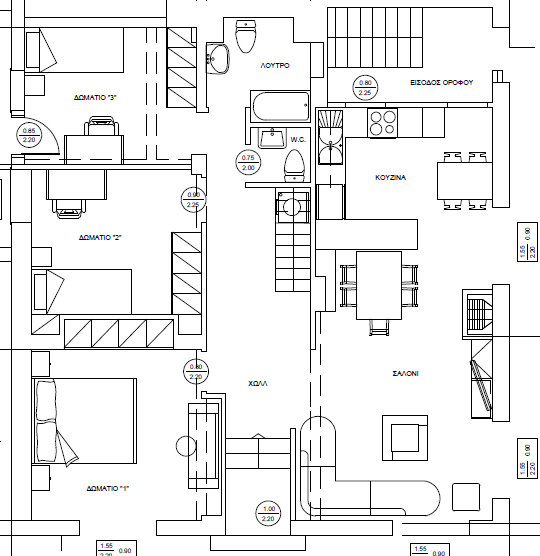 Το πάνω επίπεδο που είναι περίπου 30 τ.μ. δεν το αγγίζω προς το παρόν, το θεωρώ πιό εύκολη υπόθεση ή το αφήνω για αργότερα. Για αργότερα, αφήνω και τα υπνοδωμάτια ( δυο παιδικά κι ένα εμάς- του ζεύγους)