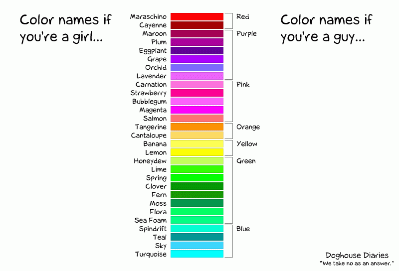 Xixi! Είναι απόλυτα διασκεδαστικό να βλέπεις πως μπορεί ένα αντρικό μυαλό ή μάλλον λεξιλόγιο, να χωρέσει μέσα στο Μοβ, 5 αποχρώσεις! Προσοχή, δεν μιλάμε για νταλτονισμό. Η wikipedia λέει για κάποια εγκεφαλική βλάβη :-D. Είναι εκεί που λες: “Τι εννοείς αγάπη μου;”. Είναι εκεί που εκείνος λέει: “Εσύ τι εννοείς; Όταν λέμε μοβ, εννοούμε μοβ”. Γιατί το μοβ οι άντρες το ακούνε σαν “φοβ-άμαι”; Από την άλλη, εμείς οι γυναίκες που τα βρήκαμε και τα ξέρουμε όλα αυτά τα χρώματα; Αγγιναρί, σταφυλί, Ορχιδέα, Λεβάντα, Γαρυφαλλί. Πόση ευκολία στη λεξιπλασία έχουμε, είναι απίστευτο! Θέλω να πω, πως ένας άντρας, ούτε κατά διάνοια Μιραράκη. Δε το \’χει ομορφιά μου το μπορντοροδοκόκκινο. Πάλι καλά που \’χει και το κόκκινο, και αυτό, ίσως γιατί είναι Ολυμπιακός. Αλλιώς προσανατολίζεται σε άλλες βασικές αποχρώσεις, όπως πράσινο ή κίτρινο. Μια έρευνα του πανεπιστημίου Syddansk Δανίας, έδειξε τα εξής: “Παρά την κοινή πεποίθηση ότι οι γυναίκες είναι πιο ομιλητικές από τους άντρες, μια έρευνα που έγινε στο Πανεπιστήμιο Syddansk της Δανίας έδειξε ότι στην πραγματικότητα οι άντρες είναι που δεν κρατάνε το στόμα τους κλειστό. Τα δύο φύλλα έχουν διαφορές ως προς τον τρόπο που συζητούν. Οι γυναίκες δίνουν ζωντάνια στο διάλογο θέτοντας ερωτήσεις και σχολιάζοντας, ενώ οι άντρες παραμένουν συχνά σιωπηλοί. Όταν, όμως, αρχίσουν να μιλάνε, καταφεύγουν σε μακροσκελείς μονολόγους.” πηγή: science illustrated. Σε άλλες έρευνες που έγιναν, αποδείχτηκε πως οι άντρες αρέσκονται στα μπλε, πράσινο και μαύρο. Ενώ δεν αντέχουν τα πορτοκαλί, μοβ και καφέ. Το κίτρινο “μιλάει” πιο πολύ στις γυναίκες, ενώ το μπλε στους άντρες. Το τελευταίο σημαντικό που έδειξαν έρευνες -για να μη βαρεθούμε κιόλας- είναι από μια έρευνα του Rikard Kuller (1976) που έβαλε 6 άντρες και 6 γυναίκες σε δύο διαφορετικά δωμάτια. Τους άντρες σε ένα μονοχρωματικό γκρι δωμάτιο και τις γυναίκες σε ένα χρωματιστό με μοτίβο. Το ηλεκτροεγκεφαλογράφημα και οι καρδιακοί παλμοί έδειξαν πως εκτός από τα εντελώς διαφορετικά συναισθήματα, οι καρδιακοί παλμοί ανέβηκαν στο γκρι δωμάτιο περισσότερο από ότι στο χρωματιστό και οι άντρες βρέθηκαν επίσης σε κατάσταση στρες. Το περίεργο όμως είναι πως οι άντρες βαρέθηκαν επίσης στο γκρι δωμάτιο περισσότερο απ\’ ότι οι γυναίκες στο γκρι δωμάτιο πάλι. Ο Kuller εντόπισε επίσης πως οι άντρες δεν μπορούσαν να επιτύχουν τον ίδιο βαθμό εγκεφαλικής ξεκούρασης με τις γυναίκες. Ha! Relax guys. It\’s only no-color situation here! Άσχετο, αλλά σχετικό για εσάς αγόρια, βρήκα εδώ οδηγίες για τα χρώματα της γκαρνταρόμπας σας, ανάλογα με τα χρώματα σας. Είναι πολύ ενδιαφέρον.