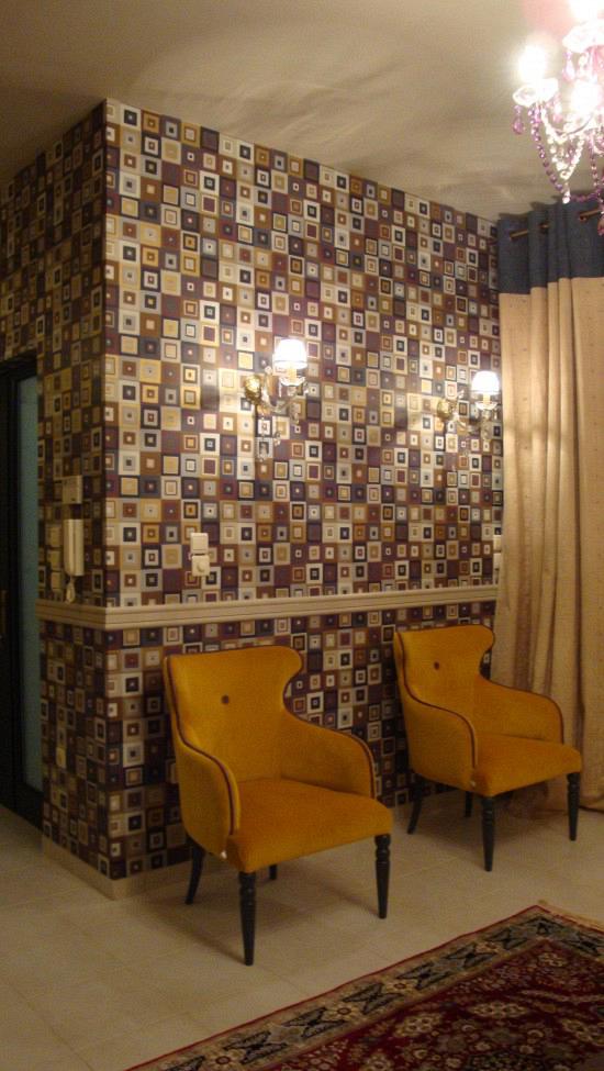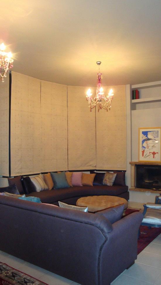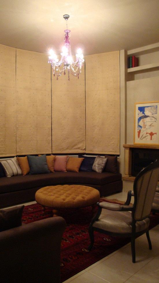 Από κάτω βλέπεις τη ταπετσαρία Claude που φρόντισε για να ντυθεί ο χώρος με διάθεση boheme. Βλέπεις επίσης τις πολυθρόνες Harlequin, που ντύθηκαν σε βελούδο beige gold και έχουν ρέλι από το ίδιο βελούδο σε χρώμα σάπιο μήλο/μοβ. Απλίκες και πάλι από κρύσταλο. Περιμένουμε ένα τραπεζάκι ροτοντούλα για να συμπληρώσει το σύνολο. Φτιάχτηκαν επίσης κουρτίνες με φάσα στο επάνω μέρος και μπρονζέ κουρτινόξυλο.