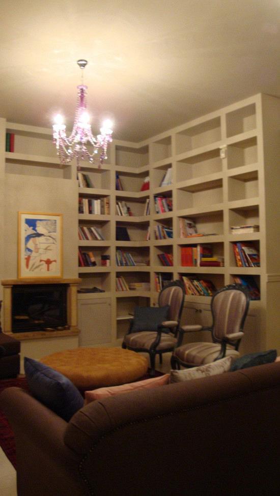Πολυθρόνες Louis XV, από ξύλο καρυδιάς που ντύθηκαν με υφάσματα του οίκου Voyage, σε ikat κέντημα και βελούδο ύφασμα. Τραπέζι/σκαμπό by Rdeco με καπιτονέ αλκαντάρα ύφασμα για να μη στεναχωριέσαι για τους λεκέδες. Καναπές και τοξωτό σκαμπό κατά παραγγελία και designed by Rdeco. Πολυέλαιος σε μοβ κρύσταλο Μαρία Αντουανέτα στυλ. Βιβλιοθήκη κατασκευή γυψοσανίδας με πορτάκια από λακαριστή δρυ, design by Rdeco.