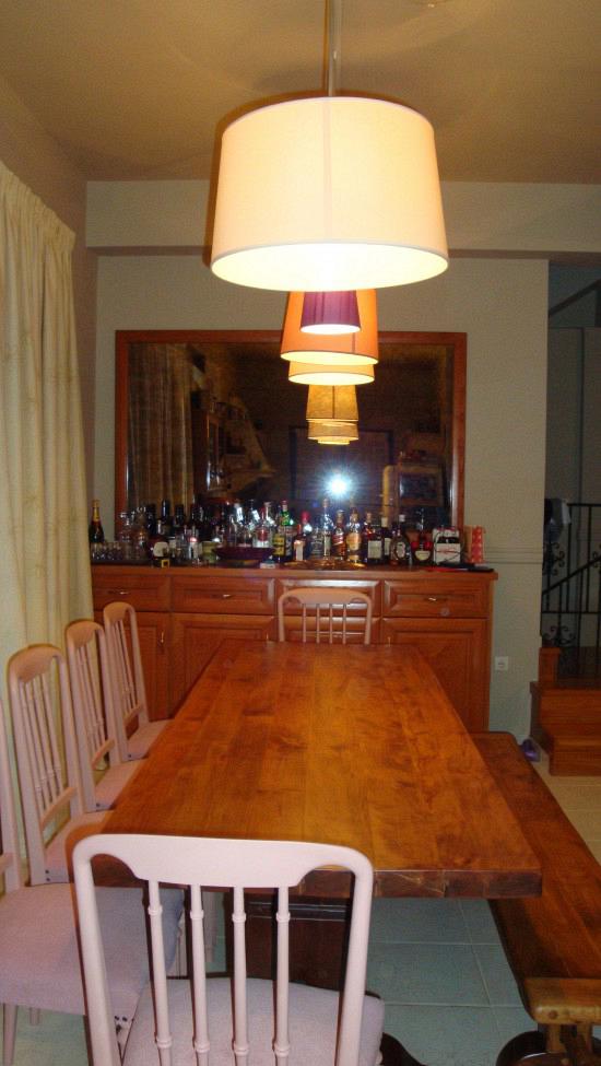 Εδώ, είχαμε ένα μοναστηριακό τραπέζι, που όμως ήθελε μια μικρή αισθητική επέμβαση. Τρίφτηκε, και έγινε νέο και έτοιμο να φιλοξενήσει την οικοδέσποινα και τους καλεσμένους της. Οι καρέκλες είναι από τη συλλογή της Rdeco και έγιναν σε άπαιχτο μοβ-ροζ για να δένουν με το υπόλοιπο θέμα, και ντύθηκαν με ακριβώς το ίδιο χρώμα ύφασμα αλέκιαστο, φυσικά. Το φωτιστικό ράγα, τρέχει σε όλο το μήκος του τραπεζιού και του χώρου της κουζίνας, και είναι και αυτό ειδική παραγγελία και designed by Rdeco, σε χρώματα του χώρου.