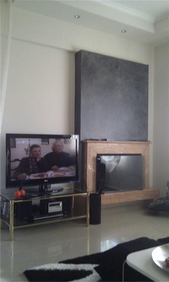 Από πάνω μας το τζάκι. Με κάποιο χρώμα παύλα μάρμαρο; Όπως και να έχει, το πρόβλημα είναι η άσχετη επένδυση σε μπεζ με το άλλου Θεού δάπεδο και αποκορύφωμα το ότι η τεχνοτροπία αυτή η γκρι δεν έγινε σε όλο αυτό το τοιχάκι, αλλά έμεινε ως σπλας! στην καμινάδα. Μπορούσε λοιπόν να έχει τραβήξει αυτή η ιστορία έως την μπαλκονόπορτα και εκεί να πας να κρεμάσεις τη Τιβί, και να ξεφορτωθείς το χρυσό τραπέζι. Σε ένα λιτό ράφι, θα έβαζες και τα συμπαραμαρθούντα της. Ακόμα καλύτερα η γυψοσανίδα θα τραβιόταν και αυτή έως το άνοιγμα και μετά θα άφηνες μια εσοχή για τη τηλεόραση.
