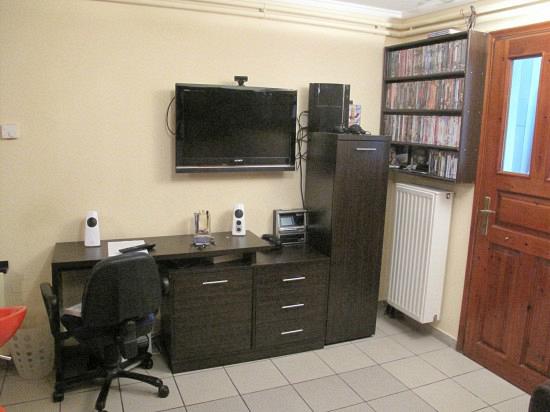 Η κερασιά που έχεις στην κουζίνα, τα πλακάκια σου, η μαύρη βιβλιοθήκη σου, σου ανοίγουν το δρόμο για το γκρι. Είναι αλήθεια πως ο καναπές σου ασφυκτιά όχι μόνο λόγω χώρου, αλλά κυρίως λόγω λάθος χρώματος. Το δε πορτοκαλί ζητάει απεγνωσμένα το γκρι και το κίτρινο μετά θα είναι μια ακόμα φρέσκια νότα. Δε θα έβαζα άλλα ράφια φυσικά, αλλά θα κοίταζα να ξεσκαρτάρω τα αρκετά ντουλάπια και ράφια που έχω, μήπως και τελικά δε χρειάζεται άλλος χώρος. Ο τοίχος του γραφείου θα μπορούσε επίσης να πάρει ένα μεγάλο ράφι στην ευθεία πάνω από τη τηλεόραση σε όλο του το μήκος, και θα έβγαζα το μαύρο κουτί με τα DVD, τα οποία και θα έμπαιναν στο ράφι που ανέφερα και θα περίσσευε και χώρος.