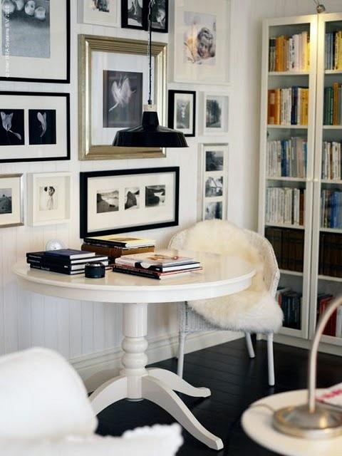 Η ερώτηση για το γραφείο σου (που για μένα πρέπει να φύγει εντελώς σαν έπιπλο από το σπίτι, μου θύμισε τα φοιτητικά χρόνια που είχα κι εγώ ένα στρογγυλό σουηδικό ροταντάκι στο σαλόνι μου, στη μέση, σα γραφείο. Δεν πιστεύω ακόμα πόσο όμορφο είχε δείξει τότε. Το στρογγυλό τραπέζι λοιπόν, μπορείς να το φέρεις στο καθιστικό σου και να δείξει κάπως έτσι: