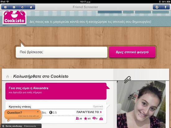 Είναι μια πρωτοβουλιά δύο νέων ανθρώπων να μαζέψουν σε μια πλατφόρμα ανθρώπους που μαγειρεύουν σπίτι τους. Ας πούμε πως κάθεσαι στο σπίτι και έχεις ταλέντο στη μαγειρική. Ας πούμε επίσης πως είσαι φρέσκος στη μαγειρική ως απόφοιτος μιας σχολής σεφ. Ας πούμε πως θα ήθελες να μαγειρεύεις αλλά δεν έχεις κανένα να μοιραστεί το φαγητό σου και να σου πει και τη γνώμη του. Βρήκες! Τι βρήκες; Υποψήφιους πελάτες. Γράφεσαι στο Cookisto και ανάλογα με την περιοχή που μένεις εγώ (ας πούμε) που πεινάω αλλά δε θέλω να βγω σε εστιατόριο και δε γουστάρω πια τα βρώμικα, ενημερώνομαι αμέσως τι μαγειρεύεις. Εγώ πάλι, ψάχνω ανάλογα με την περιοχή που βρίσκομαι και βλέπω τι μαγειρεύουν τριγύρω. Έτσι κοντά στο γραφείο μου, βρήκα την Αλεξάνδρα που λέει πως τη φωνάζουν “μαγείρισσα των Εξαρχείων”. Έχει πολύ καλές βαθμολογίες από αυτούς που αγόρασαν και έφαγαν απ΄τα χεράκια της, έχει φωτογραφία της και φτιάχνει τα καλύτερα κουλουράκια ολικής άλεσης.