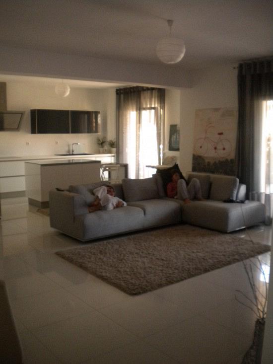 Όλα είναι λευκά, το πάτωμα γρανίτης υπόλευκος-μπέζ θα έλεγα, τοίχοι και κουφώματα λευκά, κουζίνα λευκή λάκα με γκρί graphite γυαλί στη νησίδα και plexiglass στα δυό ντουλάπια, όλα δική μου επιλογή. Το σαλόνι προυπήρχε, άλλαξα μόνο ύφασμα έβαλα ένα γκρί ασημί  (κάπως μετάνιωσα για το ασημί της ιστορίας, καλό είναι, απλά έγινε λίγο πιο glam.) Οπως αντιλαμβάνεσαι θέλω συμπληρωματικά έπιπλα, s.o.s φωτιστικά, χρώμα, χαλιά , πίνακες και βοήθεια απο εσένα…Έχω πολλές ιδέες,πολύ μεράκι, δυστυχώς όχι τρελό χρόνο και χρήμα.
