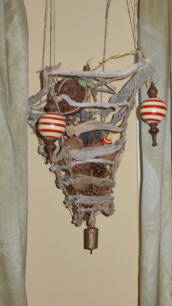 Αγαπητή Εύα, σου στέλνω και το δικό μου χειροποίητο στολίδι. Η κυρίως κατασκευή είναι από θαλασσόξυλα Καλαμάτας και ο προορισμός της είναι να γίνει φωτιστικούλι ( στο σπίτι μου όλα τα φωτιστικά έχουν κάτι από μένα).