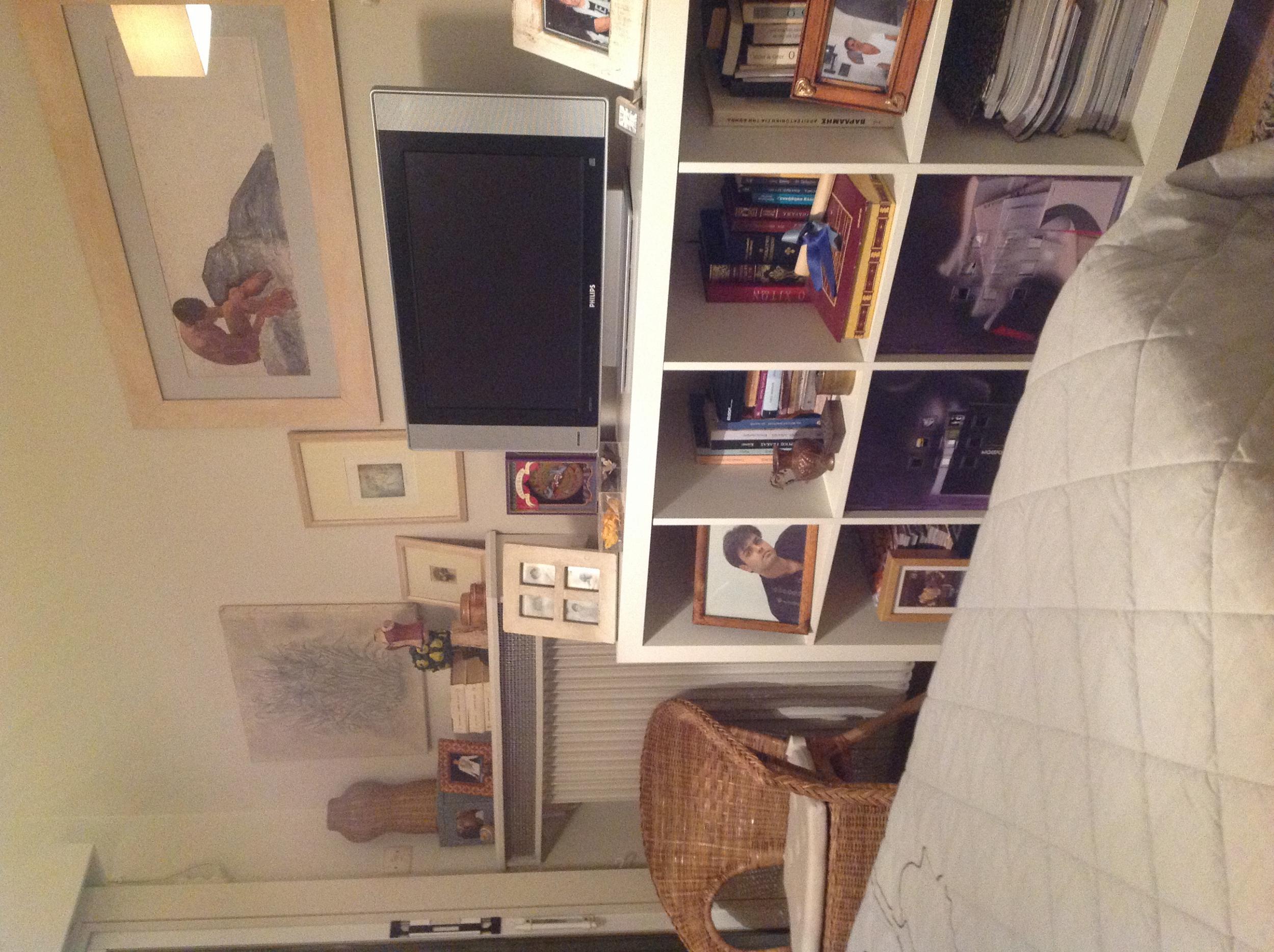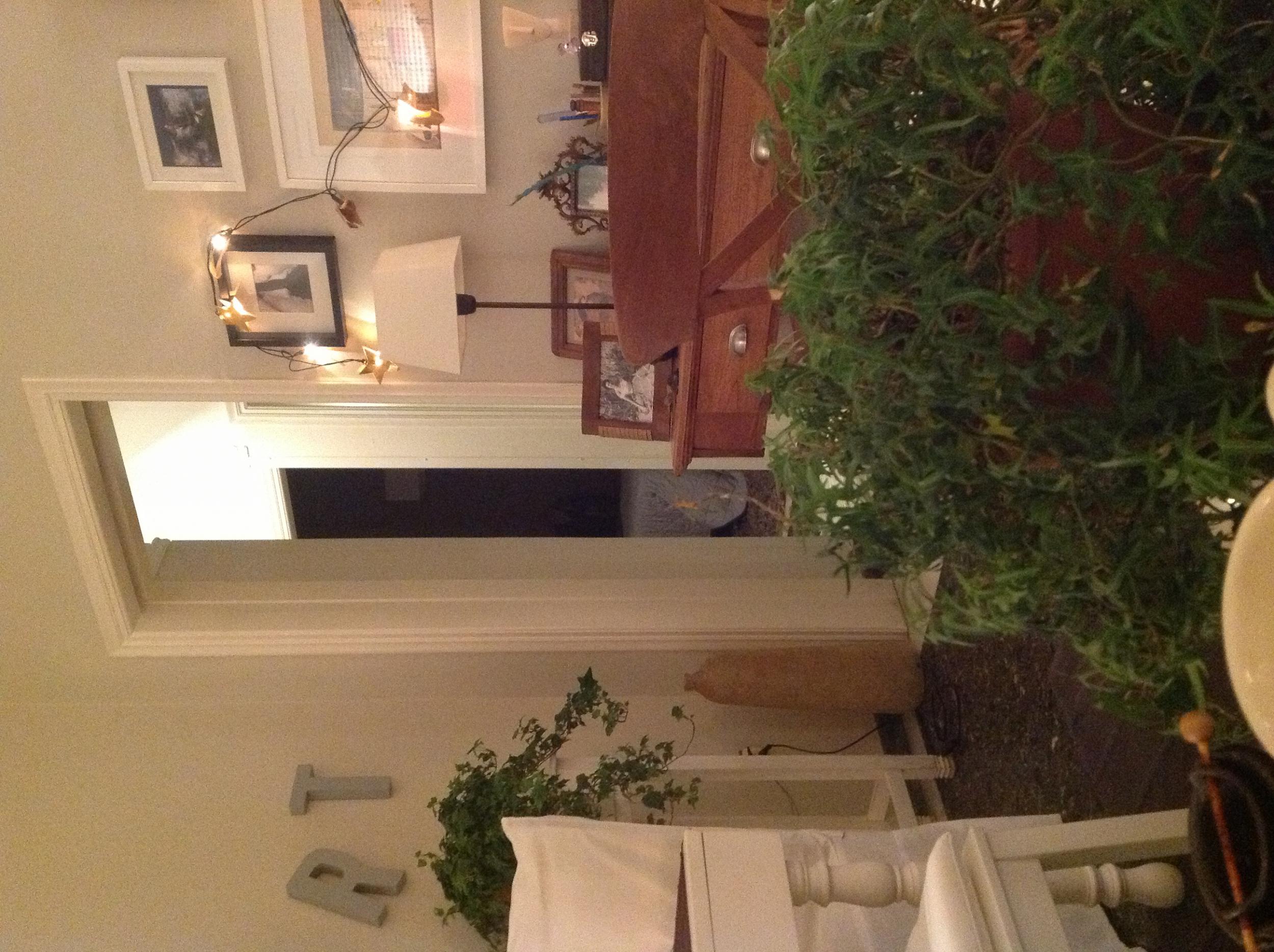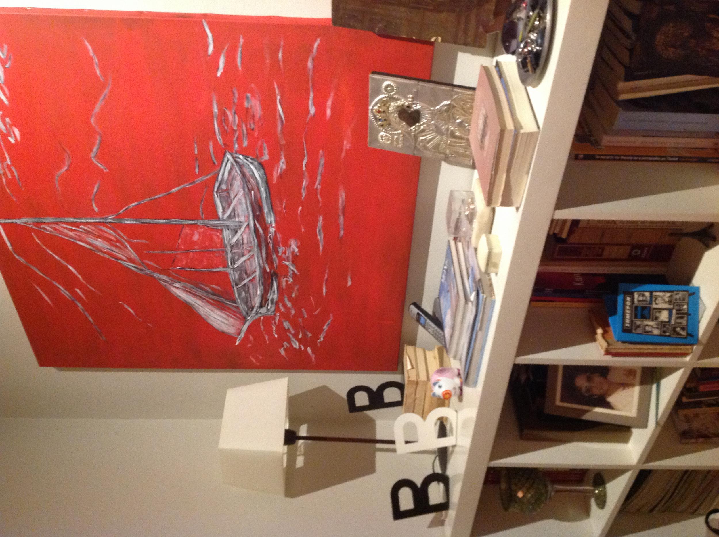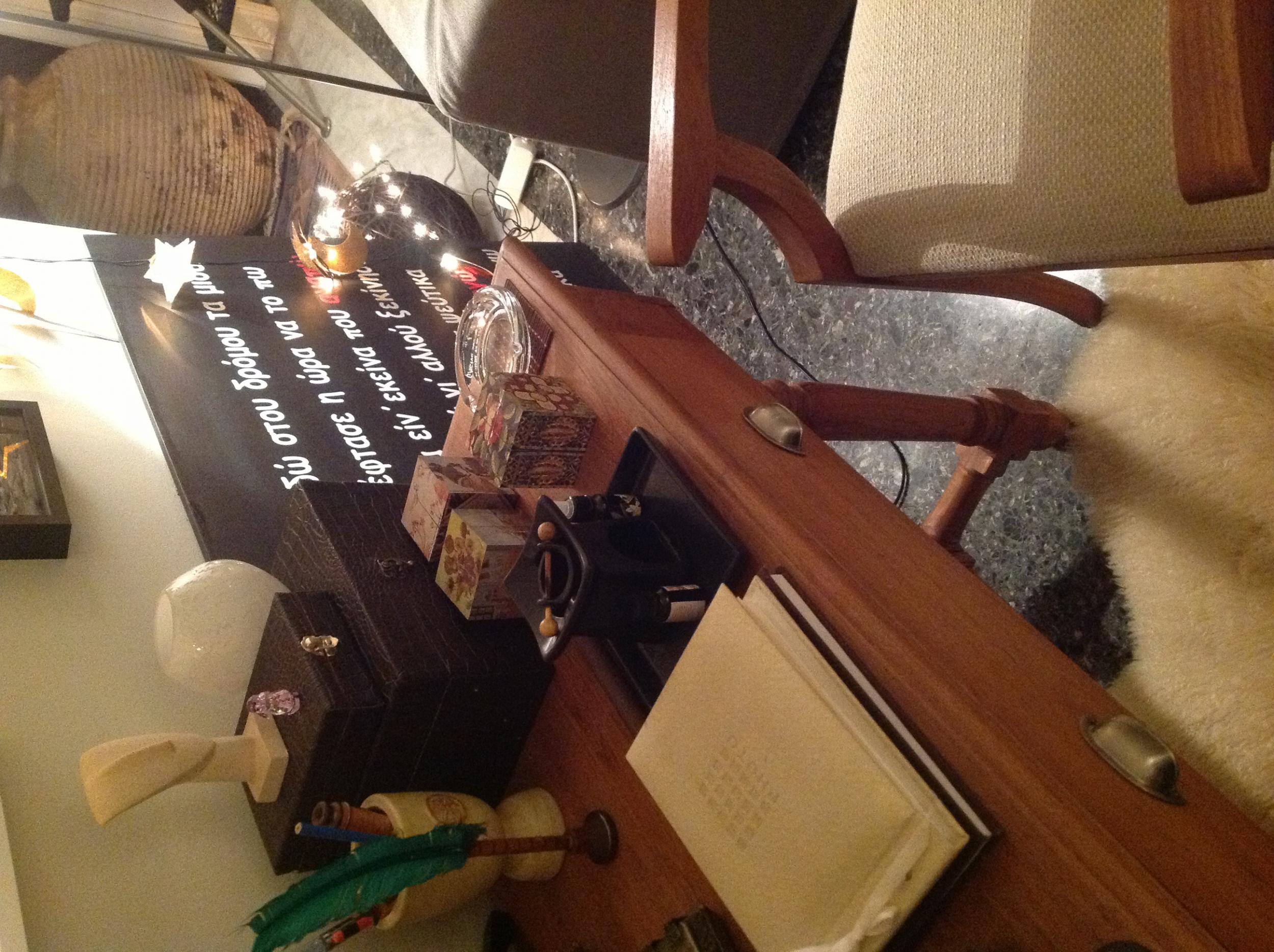 Θα σε πάω λεπτομέρειες πιο κάτω. Το γραφειάκι είναι όπως μπαίνει στο καθιστικό δεξιά. Μπροστά από το τοίχο που το χωρίζει με το διάδρομο. Ένα παλιό αντικέ γραφείο με καρέκλα ασορτμάν και δίπλα φτιάξαμε ένα πίνακα που γράφει στίχοι επάνω. Από πάνω…καδράκια…καδράκια…χιλιάδες αντικείμενα. Κλέβε ιδέες εσύ!