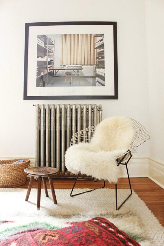 Σε μια γωνιά μια καρέκλα Bertoia, αν της ρίξεις ένα γουναρικό της χρυσής μου, μια καλαθούνα και ακόμα και αν έχεις λευκή φλοκάτη, φροντίσεις να πετάξεις μαξιλάρα ikat (υφαντά), πάλι το έχεις. Σοβαρό σημείο chic αποτελέσματος: μοντέρνα φωτογραφία στο τοίχο.