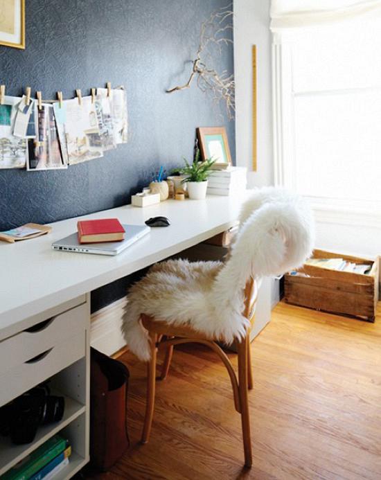 Στο γραφείο, ένα απλό λευκό έπιπλο, μια παλιά βιεννέ καρέκλα ή καφενείου αλά Ελληνικά, μανταλάκια, γουναρικά, και η ανάγλυφη ταπετσαρία της Nina Campbel, φέρνουν το boho element.