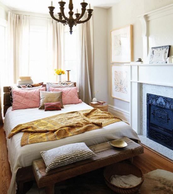 Στην κρεβατοκάμαρα, εντάξει μην κοιτάς το επικό τζάκι εδώ, ένα πάλι απλό κρεβάτι με τόνους στρωσίδια και μαξιλάρια και runners, μπορούν να δουλέψουν μια χαρά. Σημαντικό είναι να έχεις πάλι κάτι παλιό, όπως ας πούμε παλιά κουτιά σαν κομοδίνα ή κομοδίνα σαν παλιά κουτιά. Πολυέλαιος, κιλίμι-φλοκάτη-υφαντό (μερσί γιαγιά) και ένα tip: Αν έχεις κρεβάτι μπροστά από παράθυρο και δε ξέρεις τι να το κάνεις, μια κουρτίνα μονοκόματη σου φοντάρει το κρεβάτι άριστα. Ειδικά αν υπάρχει ανισότητα στις αποστάσεις από τις γωνίες.