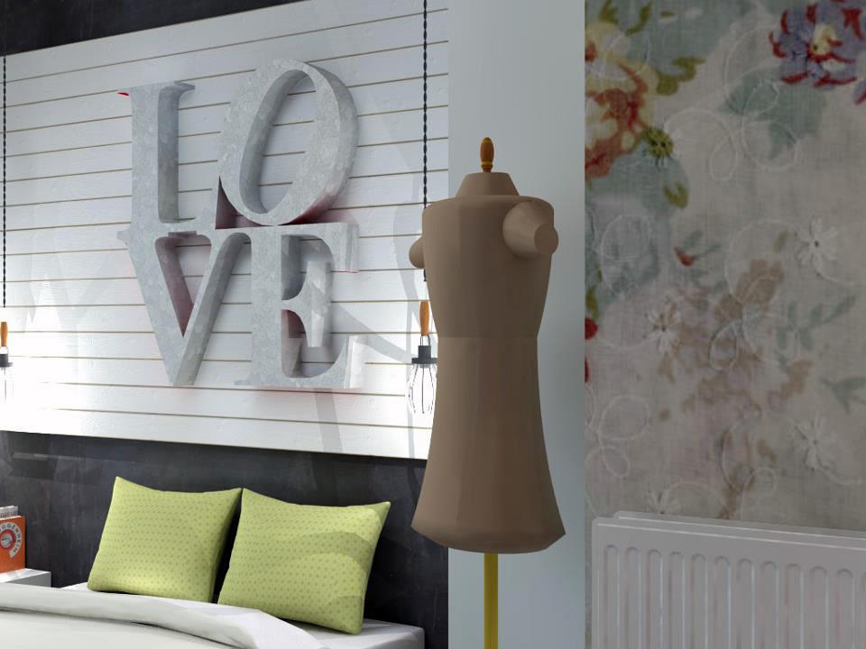 Το γλυπτό που γράφει “LOVE”, θα κατασκευάζεται από γαλβανιζέ λαμαρίνα. Θα κρεμαστεί επάνω σε ένα στρώσιμο από vintage ξυλεία. Ο τοίχος πίσω του θα βαφτεί μαυροπίνακας, γιατί θέλω λίγο μαύρο. Το μανεκέν δίπλα (υπάρχει κι αυτό) θα φορέσει αυθεντικό Christian Dior φόρεμα της θείας. Δίπλα η ταπετσαρία που λέγαμε! Σύντομα θα βρίσκεται στο Rdecoshop.
