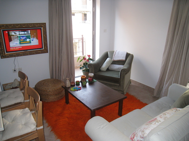 Συνεχίζω και αράζω μάλλον να βγάλω παπούτσια εκεί στην όμορφη πολυθρονίτσα δίπλα στη μπαλκονόπορτα. Δε θέλω να τα βγάλω όμως επάνω στο κόκκινο χαλί. Γιατί; Γιατί δε τους πάνε. Θα ήθελαν τα παπούτσια μου να ακουμπήσουν την κούραση τους επάνω σε ένα χαλάκι πιο απαλό σε χρώματα και ίσως μια φλοκάτη λευκή, ίσως μια μοκετούλα πιο γκρι ή ακόμα και ένα στρογγυλό χαλί μεγάλο σε χρώμα πράσινο ή καφέ. Στη συνέχεια επειδή λέω να πιω και ένα καφεδάκι, θα ήθελα σε ένα τόσο μικρό χώρο να μπορώ να τραβήξω κοντά μου το τραπεζάκι. Αυτό σημαίνει πως σε ένα τόσο πετίτ χώρο θα ήθελα σίγουρα δύο ή τρία μικρά στρογγυλά τραπεζάκια για να μη μου κλείνουν το χώρο. Χρωματικά δε θα είχα πρόβλημα με το καρυδί που υπάρχει στο τραπέζι ήδη ή ακόμα και αν δεν ήταν και τα δύο στο ίδιο χρώμα.