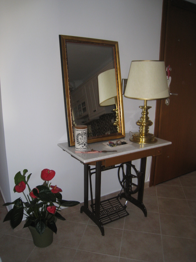 Άντε να ξεκινήσουμε από την είσοδο. Με το καλημέρα μας δηλαδή. Ανοίγω στο σπίτι το μικρό την πόρτα και μπαίνω και αφήνω τα κλειδιά μου σε όμορφο μπολ που έχω επάνω στη ραπτομηχανή. Θα ήθελα ίσως μια πιο μικρή λάμπα και αυτή να είναι στην αριστερή πλευρά της ραπτομηχανής. Εννοείται πως αυτή η λάμπα μου αρέσει πολύ, αλλά είναι τεράστια για το σημείο. Ένα ψηλότερο φυτό επίσης θα έκανε μια καλύτερη σύνθεση σε αυτό το τοίχο, βλέπε μια δάφνη τύπου μπαλίτσα που να φτάνει σχεδόν λίγο πιο πάνω από τη μέση του καθρέφτη.