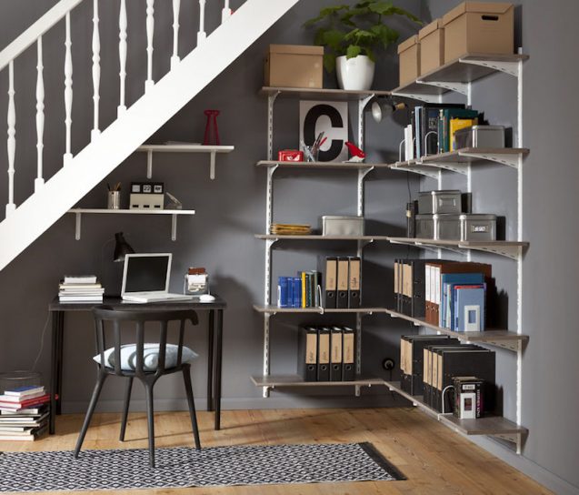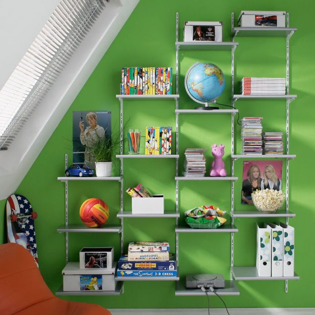 Τα ράφια τώρα. Υπάρχουν τα μεταλλικά ράφια που είναι στο πακέτο εξαρτημάτων του συστήματος αλλά όπως είδες και στα παραδείγματα μπορείς να επιλέξεις ανάμεσα σε πολλές λύσεις ξυλείας για ράφια. Ιδανικά ταιριάζει η τάβλα μελαμίνης από τη LEROY MERLIN που έβαλα και πρόσφατα στο διαμέρισμα ενός Dj, όπως ιδανικά και το OSB που μας δίνει πιο industrial λύση. Σκέψου το με μαύρες βέργες και βραχίονες.