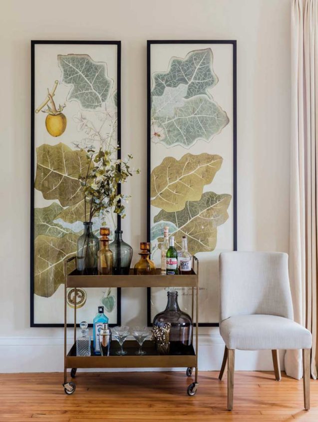 Ένα καρότσι μπαρ με δύο μεγάλα φύλλα ταπετσαρίας σε κορνίζα ή πίνακες