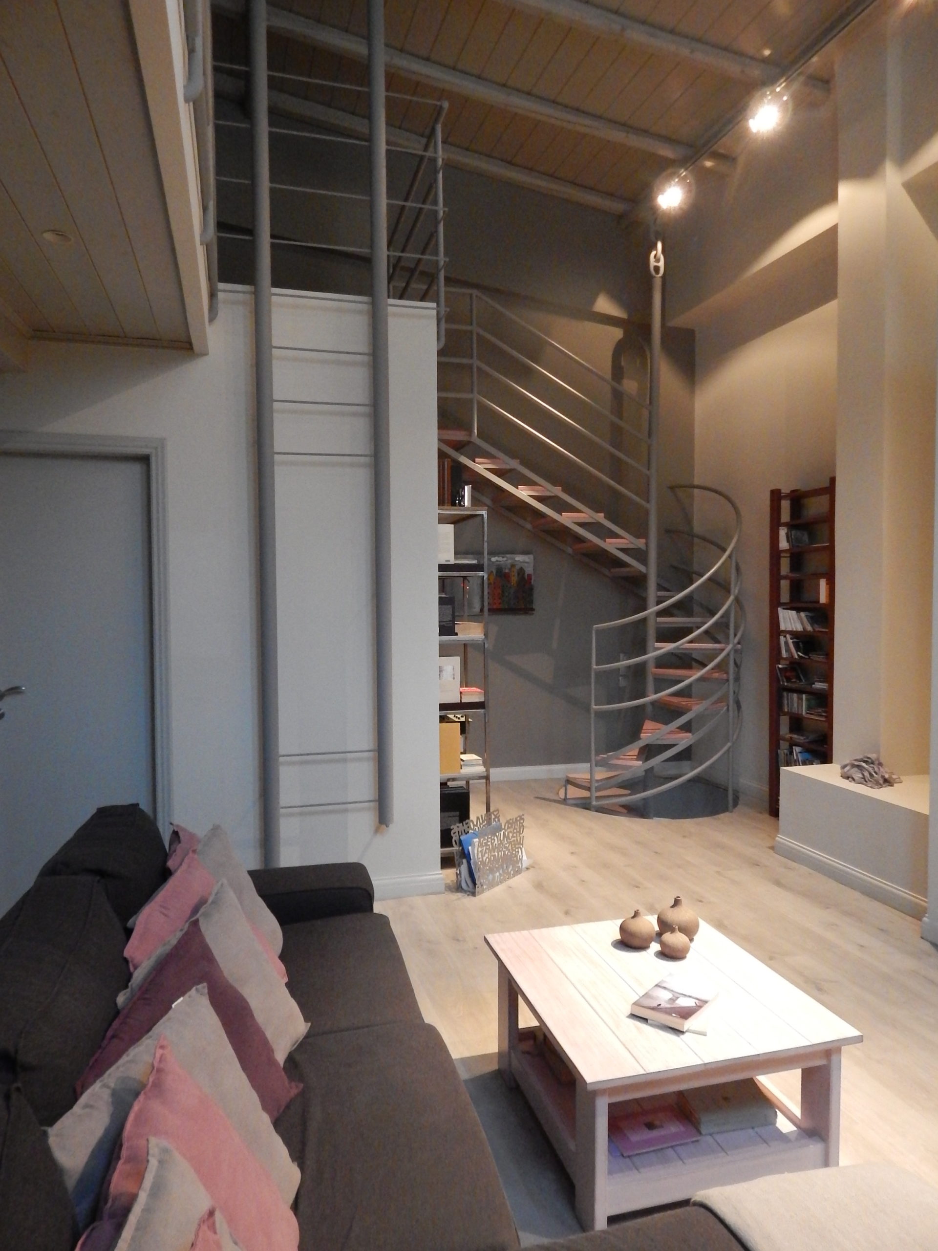To loft που λέγαμε τις προάλλες, προχωρά, με λίγο γρήγορους αλλά και αργούς ρυθμούς, αναλόγως της φύσης των εργασιών που γίνονται. Τώρα βάφουμε γκρι οροφή με βερνίκι. Μια ιδέα για να έχετε…